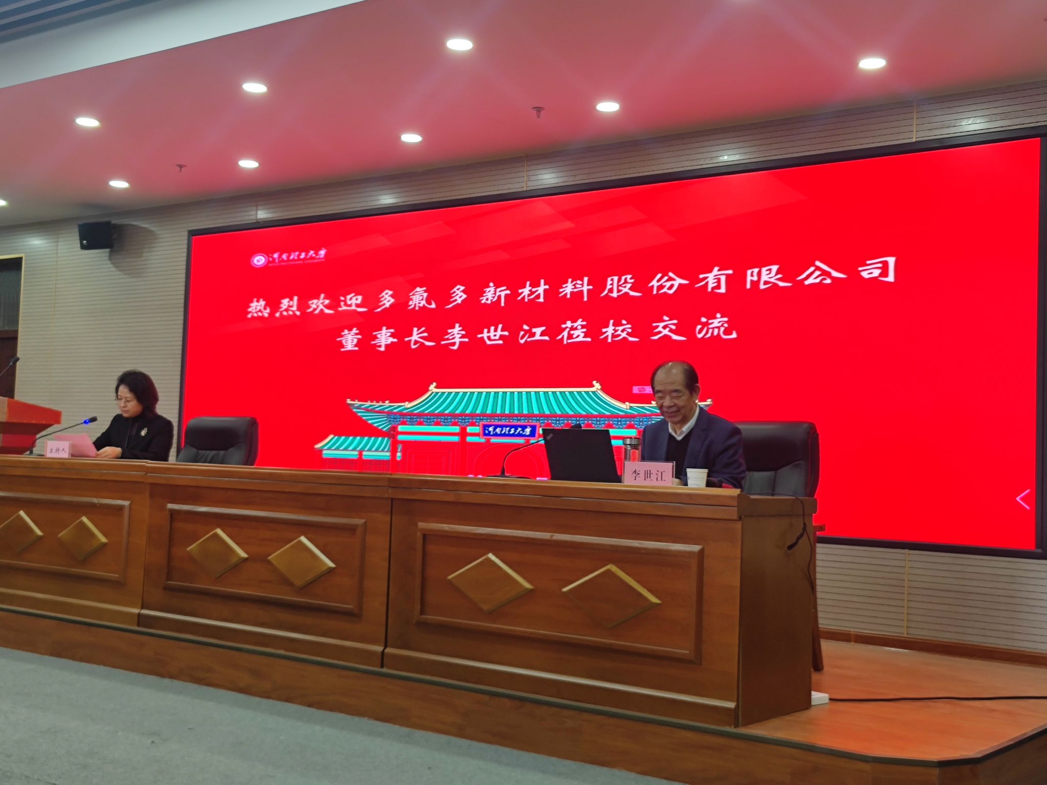 李世江围绕多氟多新材料股份有限公司的发展与行业趋势,以“硅基文明的本质是能源革命”为核心主线,生动讲述了能源领域从碳基到硅基、再到清洁能源的迭代历程。他指出氟基材料在能源革命中的关键地位,深入解析氟硅技术与我国“氟锂硅协同”的发展模式,提及钠电池未来的发展方向,介绍了企业生产管理智能模型,并强调政企研融合对创新的推动作用。最后,师生与李世江进行了热烈的交流。