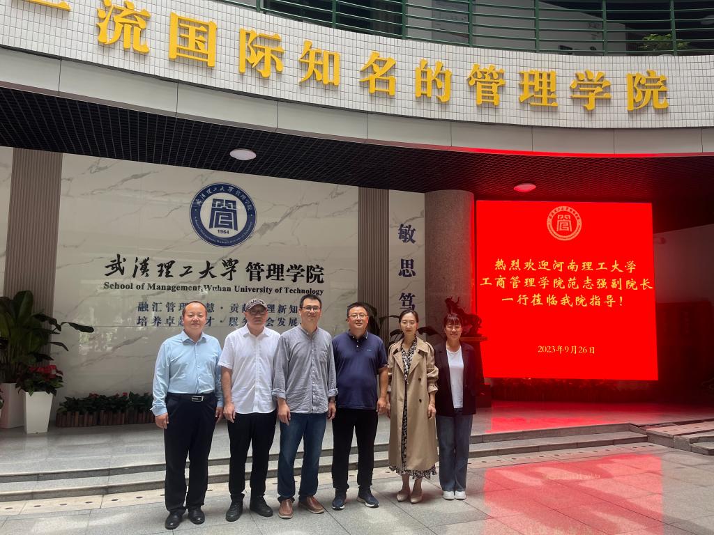 9月26日下午,我院副院长范志强、人力资源管理系主任王迪、市场营销系主任龚关、工商管理系主任李志芳到武汉理工大学管理学院走访调研。武汉理工大学管理学院副院长王超、人力资源管理系副主任胡浩、市场营销系副主任殷向洲、实验室中心主任陈久云和教师代表参会。双方就人力资源管理国家一流专业建设、实验室建设等方面进行了深入交流。