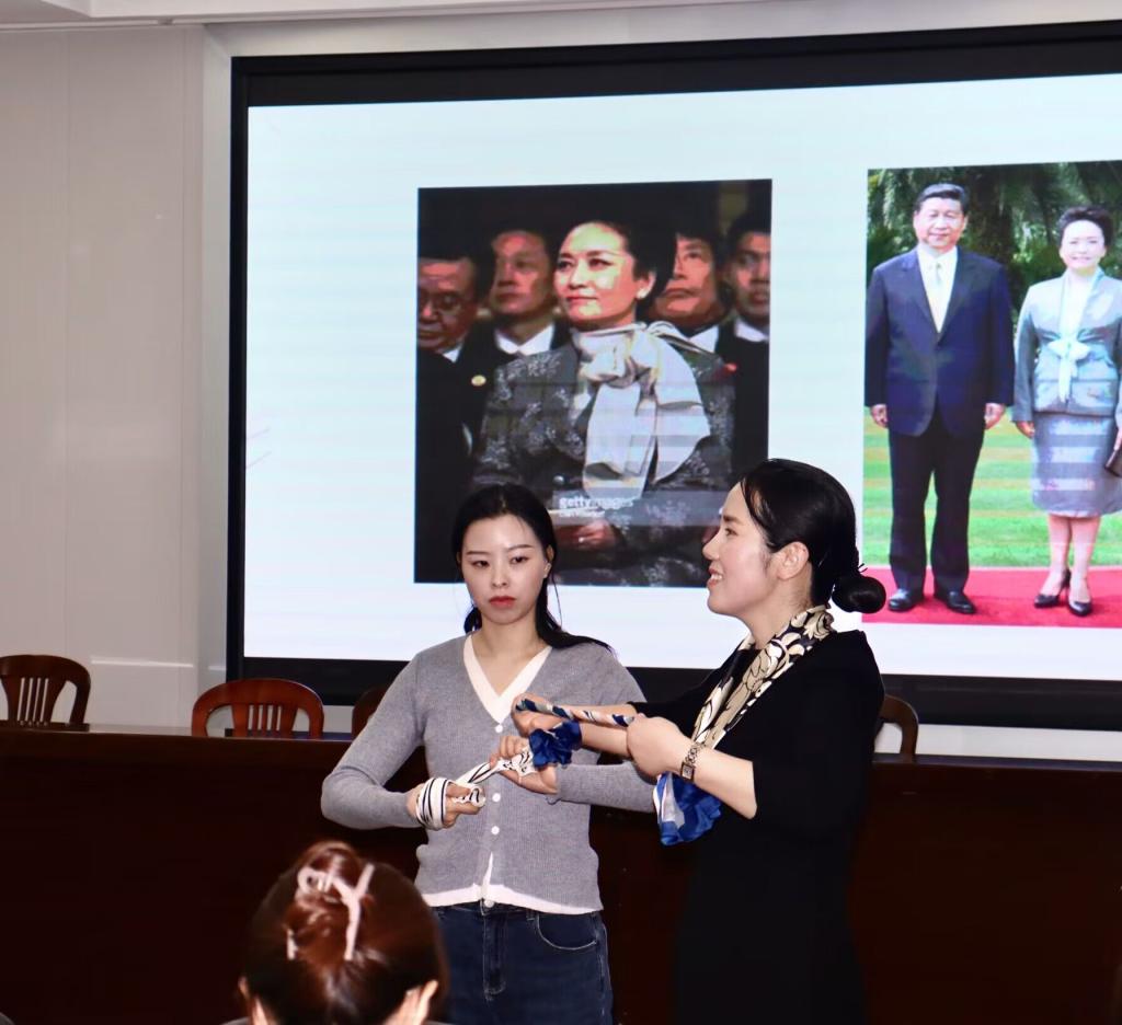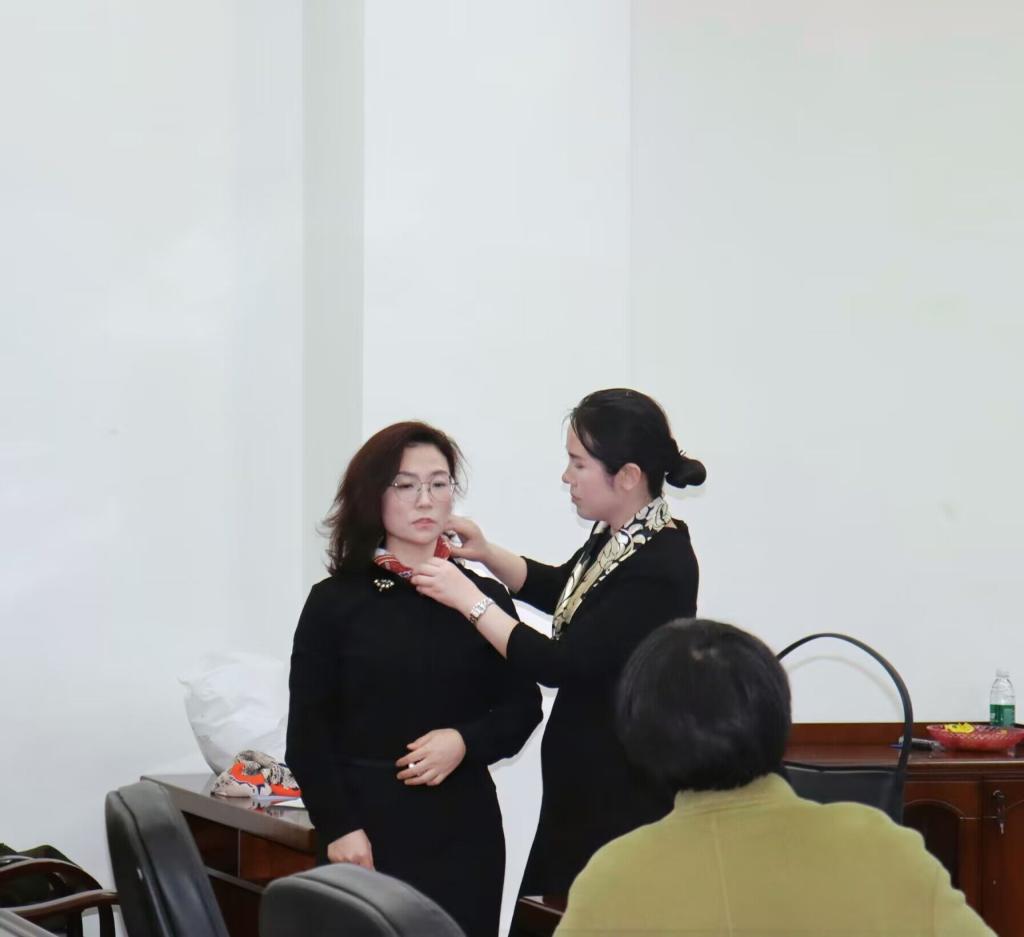 本次活动以探讨形象为主,分为“形象的内涵、优雅仪态、百变丝巾”三个环节。首先对于女性仪容,杨老师指出女性的美更多表现在内在之中。她以生动形象的话语表达女性要修饰自己应做到“优雅仪态、精致外形、知礼懂礼、锦心绣口”四个方面,从而引出建设良好家风以促进民族复兴、文化复兴的美好愿景。在“优雅仪态”环节中,杨老师带领教工们进行站姿、坐姿等仪态训练,大家以认真积极的态度进行学习。“百变丝巾”环节中,大家积极地向杨老师探讨丝巾的系法与搭配。通过现场演练,每个人身上的丝巾都变成最适合自己的样子,衬托出女性之美。活动最后,杨老师谈到女性在繁忙的生活中承担着各种角色和工作,而往往忽略自己。因此她希望大家“在忙碌的生活中善待自己,人生的意义在于活的精彩,爱自己才是终身浪漫的开始。”