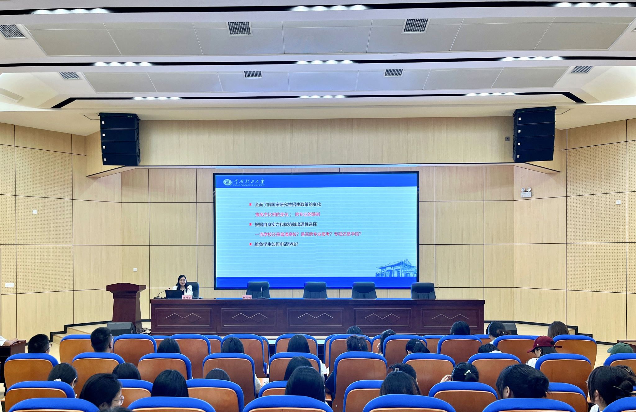 会议伊始,傅端香从考研政策、跨专业限制和推免生比例的变化三个方面作出阐述。她表示:面对当下严峻的考研就业形势,同学们更要提前了解所报专业和目标院校,根据自身实力和优势做出理性选择,并且不断深化专业认知和自我定位,尽早明确职业发展方向。随后,傅端香结合自身经历和身边事例鼓励同学们积极考研。她指出考研是学生提升自身综合素质以及增强就业竞争力的重要途径,对于个人成长和职业发展具有重要意义。最后,赵伟利对会议进行总结,他表示,态度决定一切,同学们要坚持不懈、充满信心、笃行慎独,同时在“研”路途上,学院将积极落实好考研学生的护航、引领和关怀工作,发挥后盾作用,全力保障学院每一位考研学子顺利上岸。“研”阵以待,筑梦未来。
