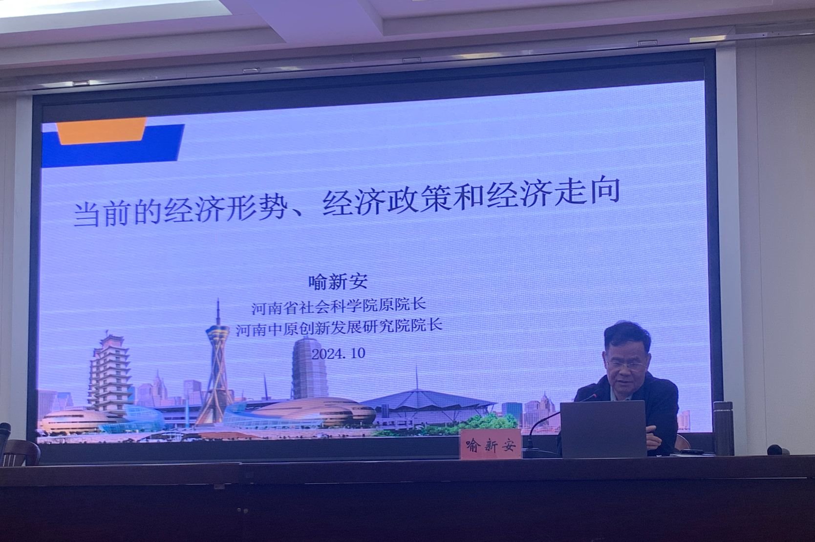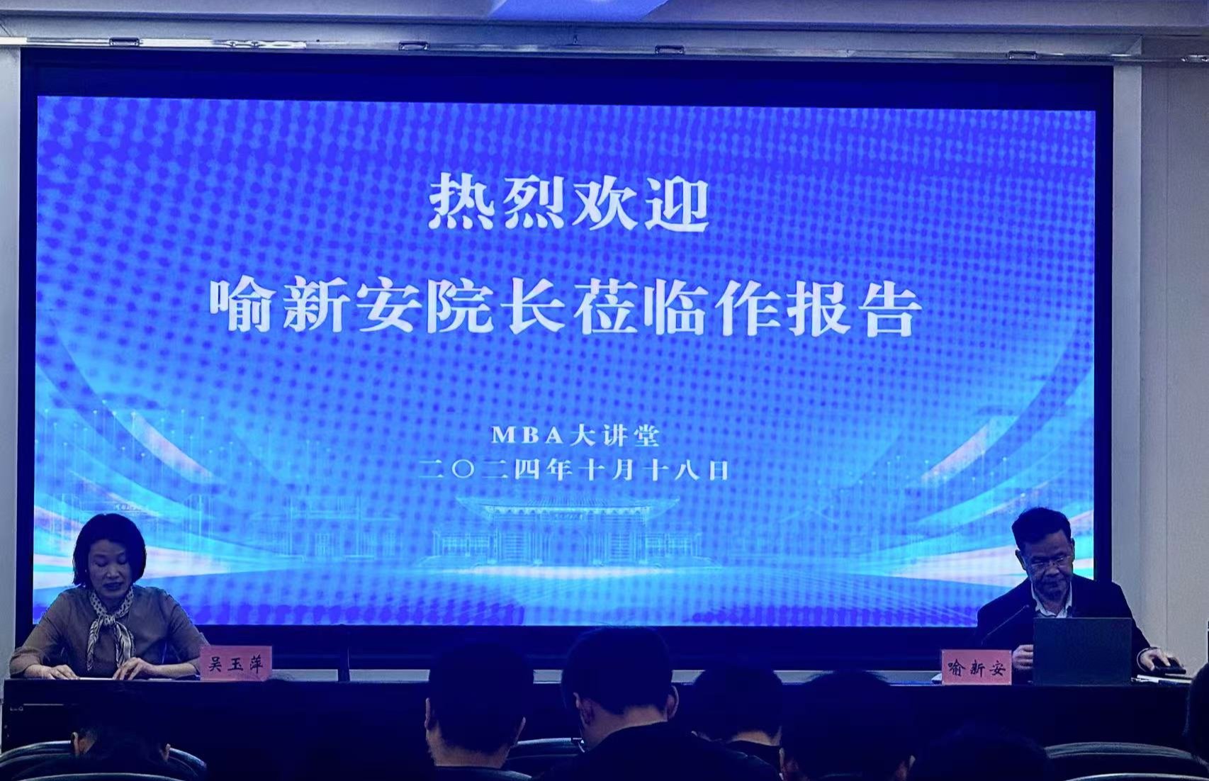 2024年10月18日下午,工商管理学院MBA教育中心成功举办了一场极具影响力的经济形势专题讲座。此次讲座特邀河南省政协常委、中国(河南)创新发展研究院院长、河南省社会科学院原院长喻新安为教师代表、2024级MBA和2024MEM学生作题为《当前的经济形势、经济政策及前景》的讲座。本次论坛由副院长吴玉萍主持。