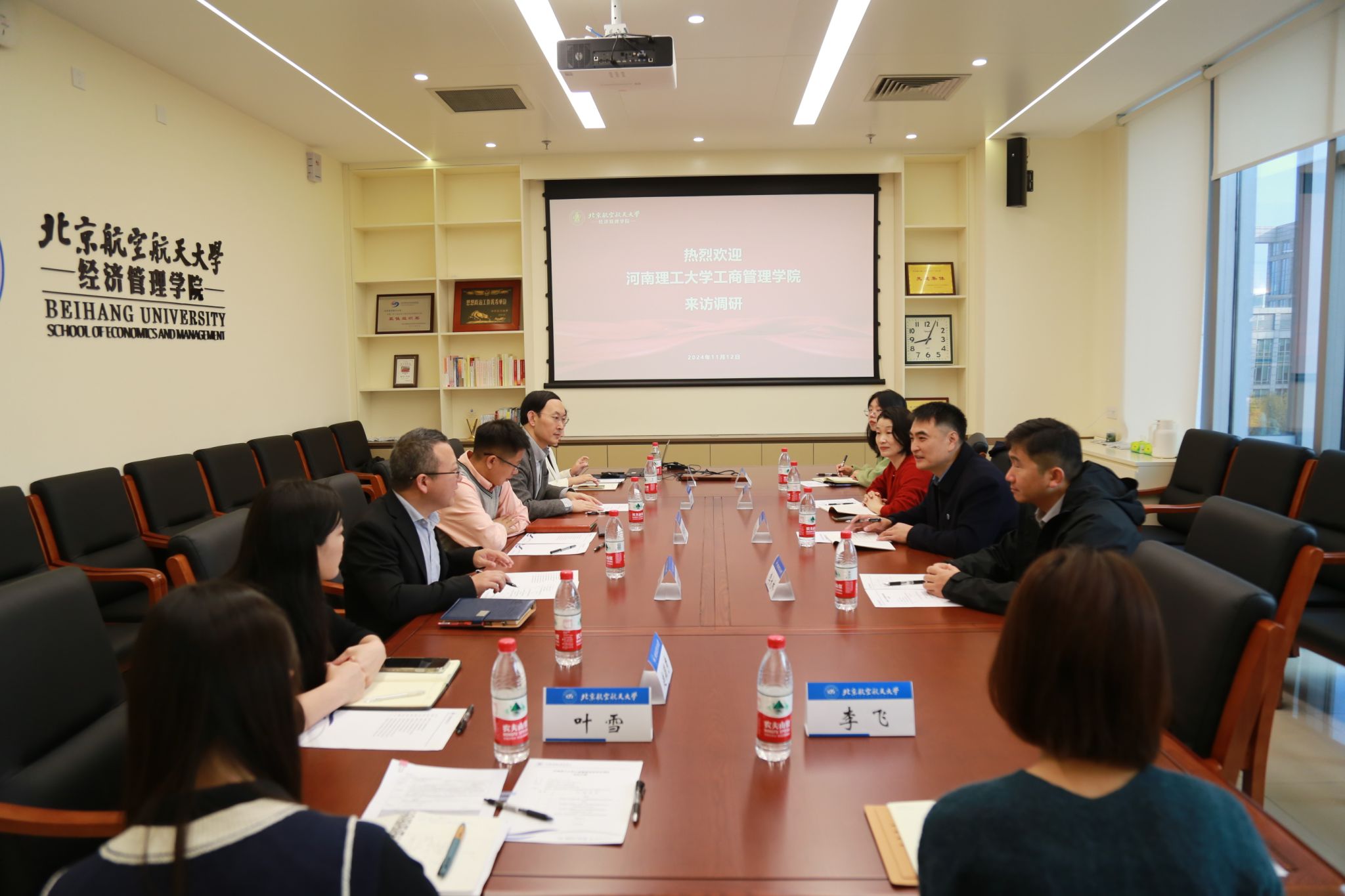 11月12日,郭学鹏书记率队到北京航空航天大学经济管理学院调研。北京航空航天大学经济管理学院党委书记郑海涛、副院长秦中峰、MBA教育中心主任李亚帅、副主任梁娜、赵颖秀等老师参加本次调研交流。