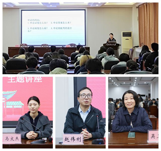 会议伊始,赵伟利代表学院对马文杰表示热烈欢迎并对其作简要介绍。随后,马文杰围绕“申论四问”、考试大纲、申论误区、考试与做学术的区别等方面进行详细介绍,让同学们更加清晰地明确考试要求,掌握备考策略。接着,马文杰进行选课指导,介绍了预听课、线上线下课程及答案选择等方面技巧,以便同学们备考事半功倍。讲座过程中,马文杰以申论真题中的典型例题为例进行了现场演练,对解题技巧做了具体分析,让同学们受益匪浅。讲座进入尾声,马文杰结合自身丰富的教学经历,为学子们提供了许多实用的备考方法和技巧,并鼓励同学们注重实践与理论结合,脚踏实地,不断提升自身综合素质,斩获佳绩。