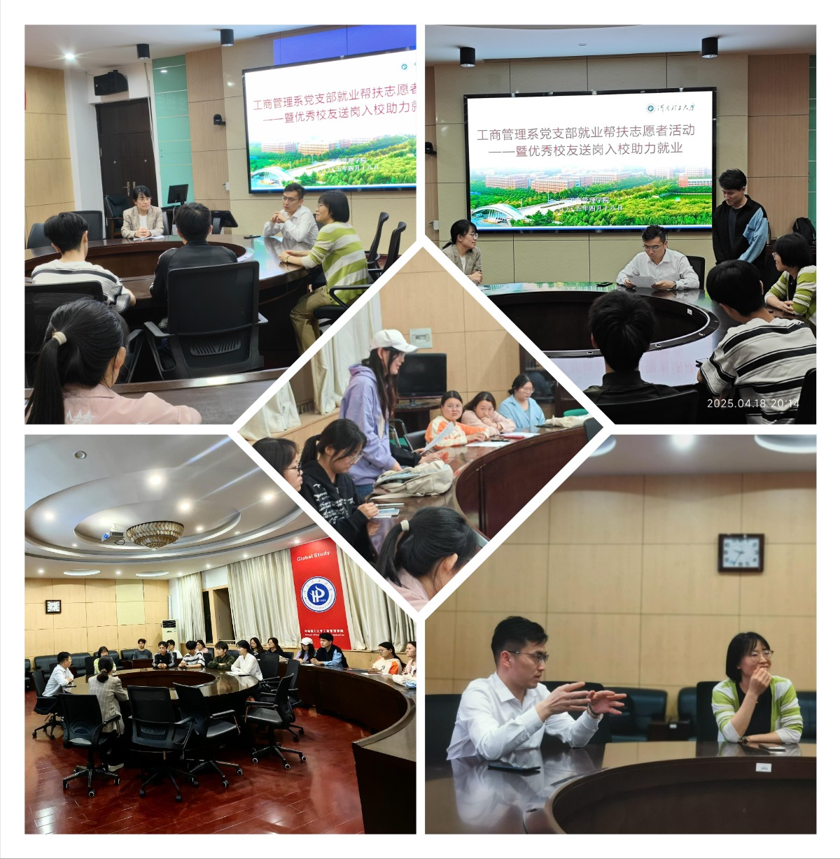 为精准助力2025届毕业生高质量就业,4月18日,我院工商管理系党支部举办“优秀校友送岗入校”活动。活动邀请2011级工商专业校友、胡润中国500强企业区域人事经理孙进朝返校开展就业指导暨专场招聘,系党支部书记原白云、主任李志芳及任腾飞老师参加。