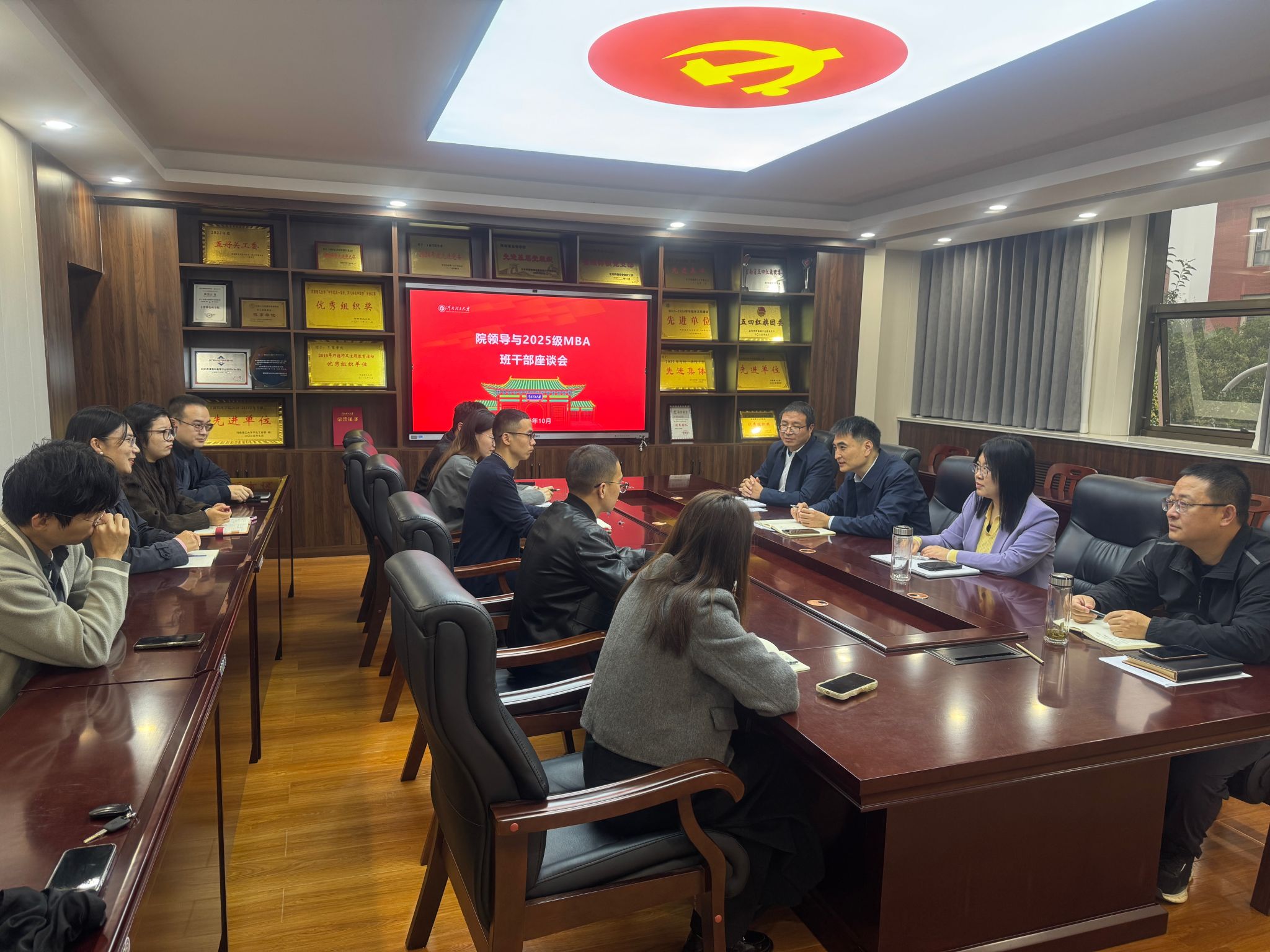 为深入了解MBA新生学习动态,凝聚班集体力量,9月17日上午,学院在2201会议室召开院领导与2025级MBA班干部座谈会。学院党委书记郭学鹏、院长傅端香、党委副书记赵伟利、副院长范志强参加会议,与2025级MBA班干部进行面对面交流。