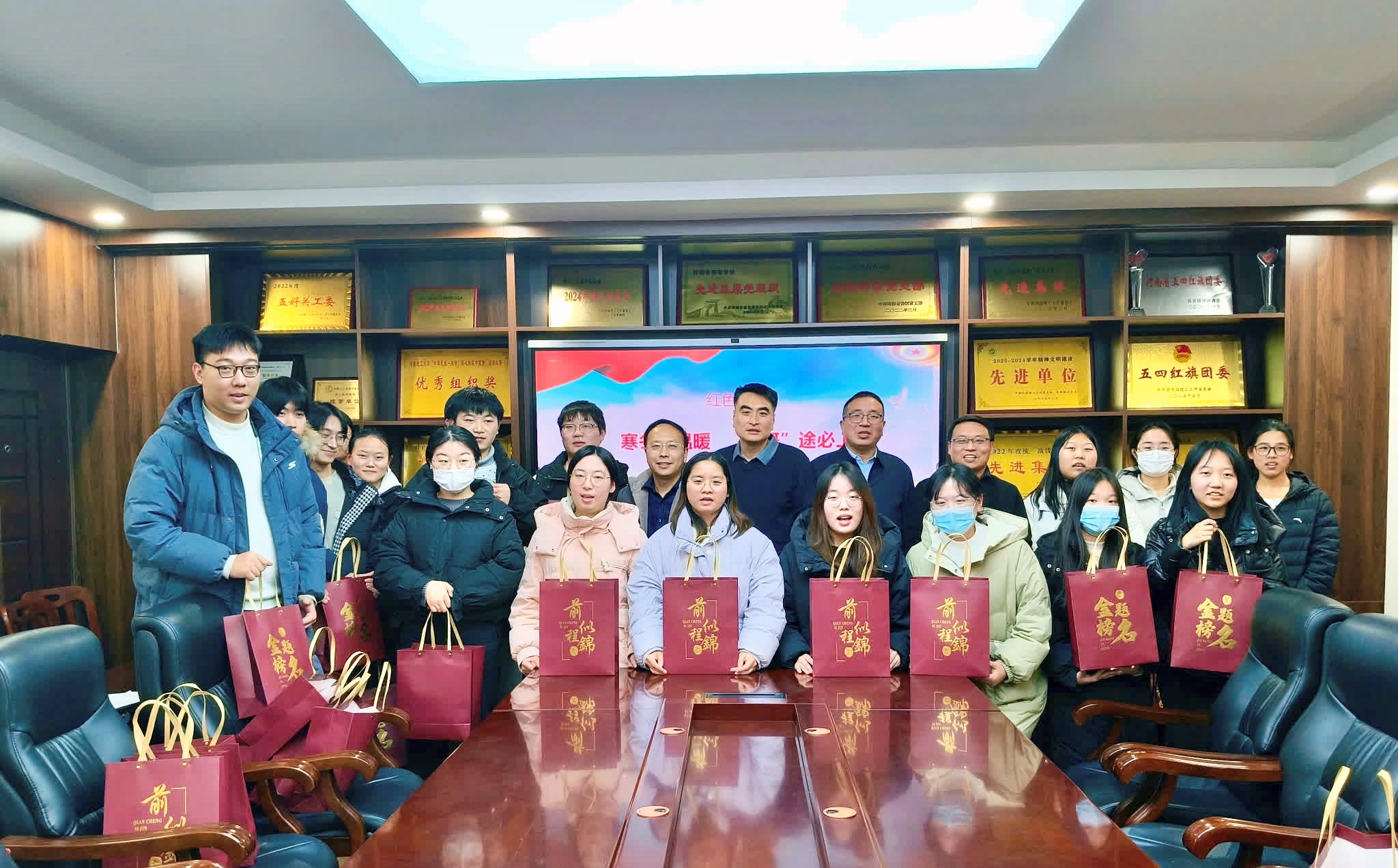 活动尾声,学院领导及教师代表亲手为每位考研学子送上“考研六件套”加油包。这份饱含学院关怀的礼物,进一步烘托出温馨的现场氛围,全体人员合影留念,定格下这一暖心瞬间。