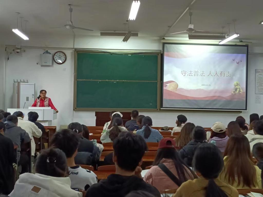 为响应法治宣传教育月的活动,提高学生的法治意识,促进校园法治建设,营造浓厚法治氛围,11月21日,2022级学生辅导员崔冬霞在3203教室为同学们作法治理论宣讲,引导同学们遵纪守法、依法律己、据法行事,将法律观念渗透至同学们日常生活的点滴中。