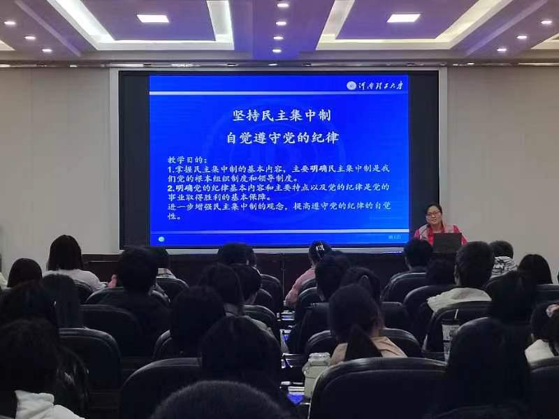 宣讲伊始,崔冬霞分别从定义与基本原则、历史沿革、发展的重要性以及实施中的具体制度四个维度,对民主集中制进行了全面而详尽的剖析。在对民主集中制讲解的过程中,崔冬霞表示入党积极分子的选拔是这两个过程相辅相成的结果,强调了“少数服从多数”原则在民主集中制中的重要作用,也展示了党坚持民主集中制带领人民取得的累累硕果。阐述了民主集中制的精髓后,崔冬霞进一步深入讲解了党员如何自觉遵循党的纪律,以实现党性修养的提升和党的事业发展。崔冬霞不仅强调了党员在成长过程中必须遵循的纪律规范,还结合实例为同学们介绍了自觉遵守党的纪律的重要性,她强调作为党员必须以身作则,身体力行树立遵守党的纪律的榜样。崔冬霞表示,功夫在平时,她希望大家从点滴做起,响应习近平总书记“一个党员就是‘一面旗’”的号召。
