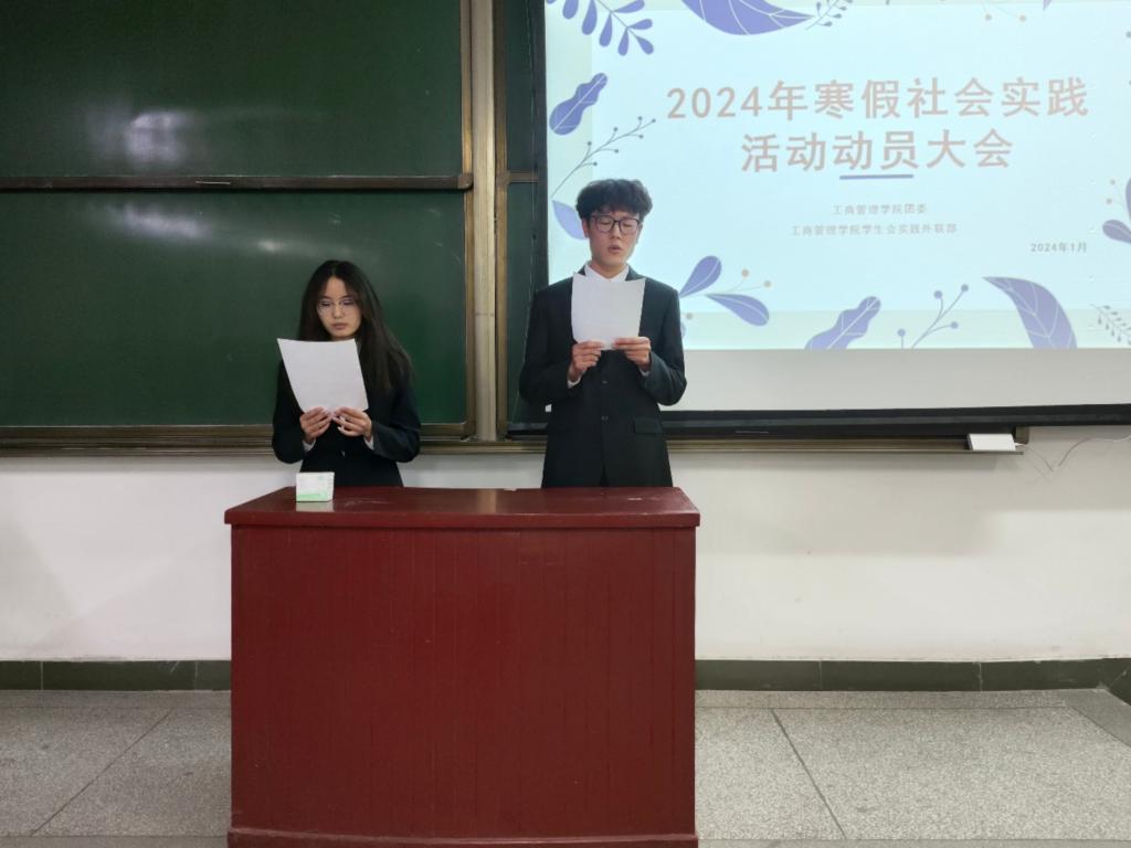 为加深我院学生对社会实践活动的理解,促使寒假实践活动的顺利进行,1月7日晚,工商管理学院学生会实践外联部在经管楼1204教室举办2024年寒假社会实践动员大会。实践外联部成员王佳文、李遥遥担任主持人,实践外联部部长程睿泽、副部长彭嘉琰对本次活动进行具体讲解,工商23级各班学生干部参加此次会议。