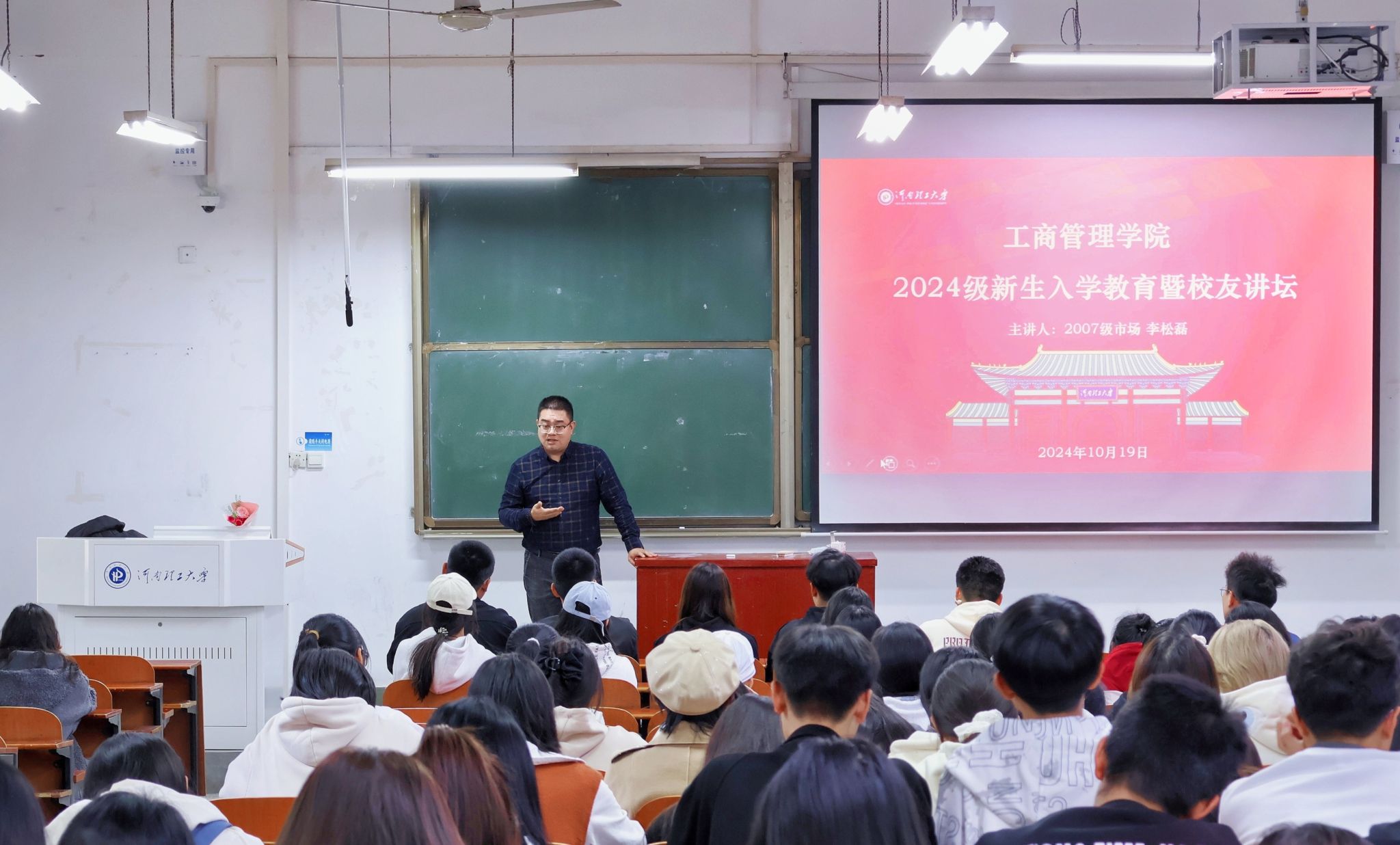为帮助我院新生树立专业思想,转变角色定位,尽快适应大学生活。10月19日下午,我院2007级市场营销专业校友李松磊受邀在经管楼1112开展2024级本科新生入学教育讲座,讲座由辅导员张浩然主持,各专业辅导员及2024级新生参会。