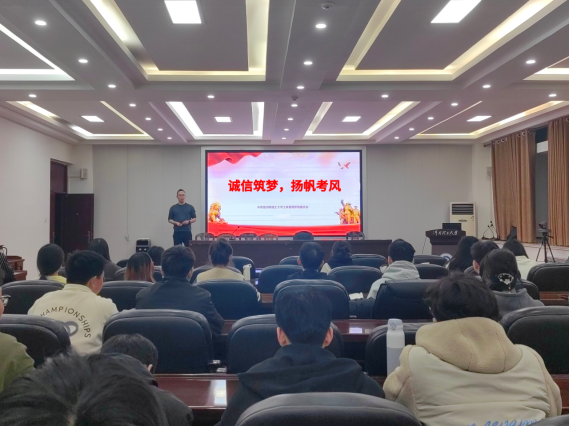 为加强考风建设,弘扬诚信考试精神,引导同学们树立正确的考试观念,营造风清气正的考试环境。10月19日上午,工商学院在经管楼1105教室举办“诚信筑梦,扬帆考风”考风建设主题讲座。我院团委书记卢宏亮担任主讲人,工商23级共85位同学积极参加。