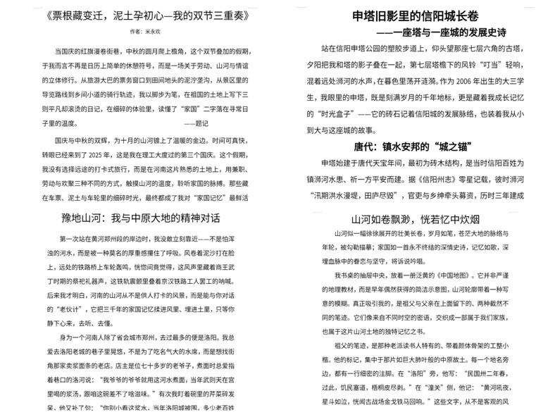 征文比赛共收到多篇优秀作品,题材丰富、立意深远。参赛同学或结合个人经历,或回望历史变迁,或抒写壮丽山河,充分展现了新时代青年对“国家记忆”的深刻思考与独特感悟。其中,米永欢同学的《票根藏变迁,泥土孕初心——我的双节三重奏》以独特视角记录双节期间的观察与思考,体现出浓厚的人文关怀与家国情怀;吕凤同学的《申塔旧影里的信阳城长卷》以千年古塔为轴,以温婉笔触勾勒信阳古城文脉;朱春云同学的《豫地山河:我与中原大地的精神对话》则融个人乡情于文化洞察,传递出对国家历史记忆的深切共鸣,文笔真挚,情感动人。