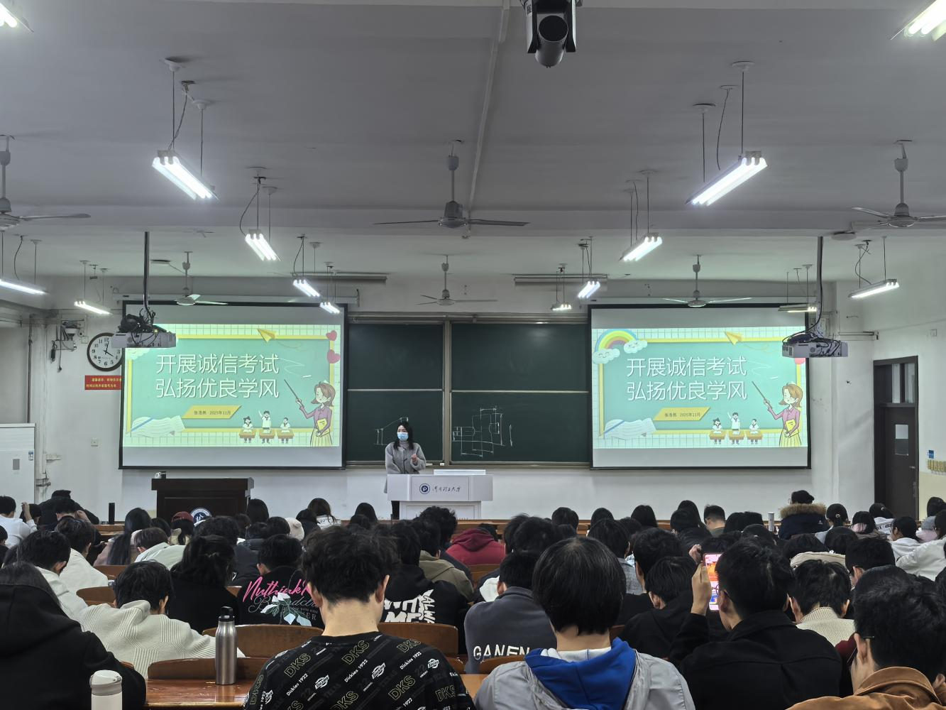 为引导学生树立正确的考试观念、提高诚信意识,加强学风建设,营造风清气正的考试环境,11月25日下午,工商管理学院在三号教学楼3106、3107教室举办“开展诚信考试,弘扬优良学风”主题教育讲座。本次讲座由我院团委书记卢宏亮及辅导员张浩然担任主讲人,工商24级、25级共200余位同学积极参加。