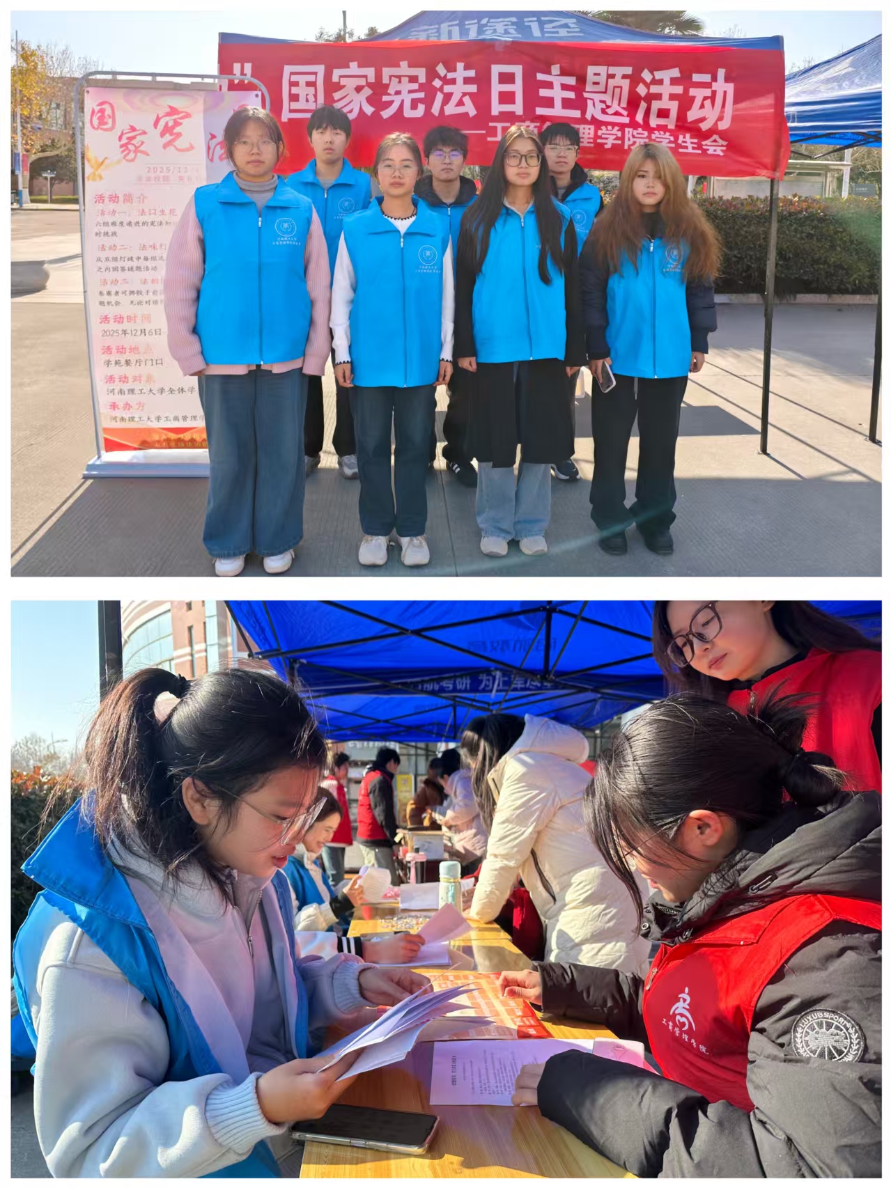 为弘扬宪法精神,让法治文化浸润校园,12月6日至7日,工商管理学院学生会于学苑餐厅门口开展“法治校园,宪在行动”国家宪法日主题活动,吸引全校众多师生参与。