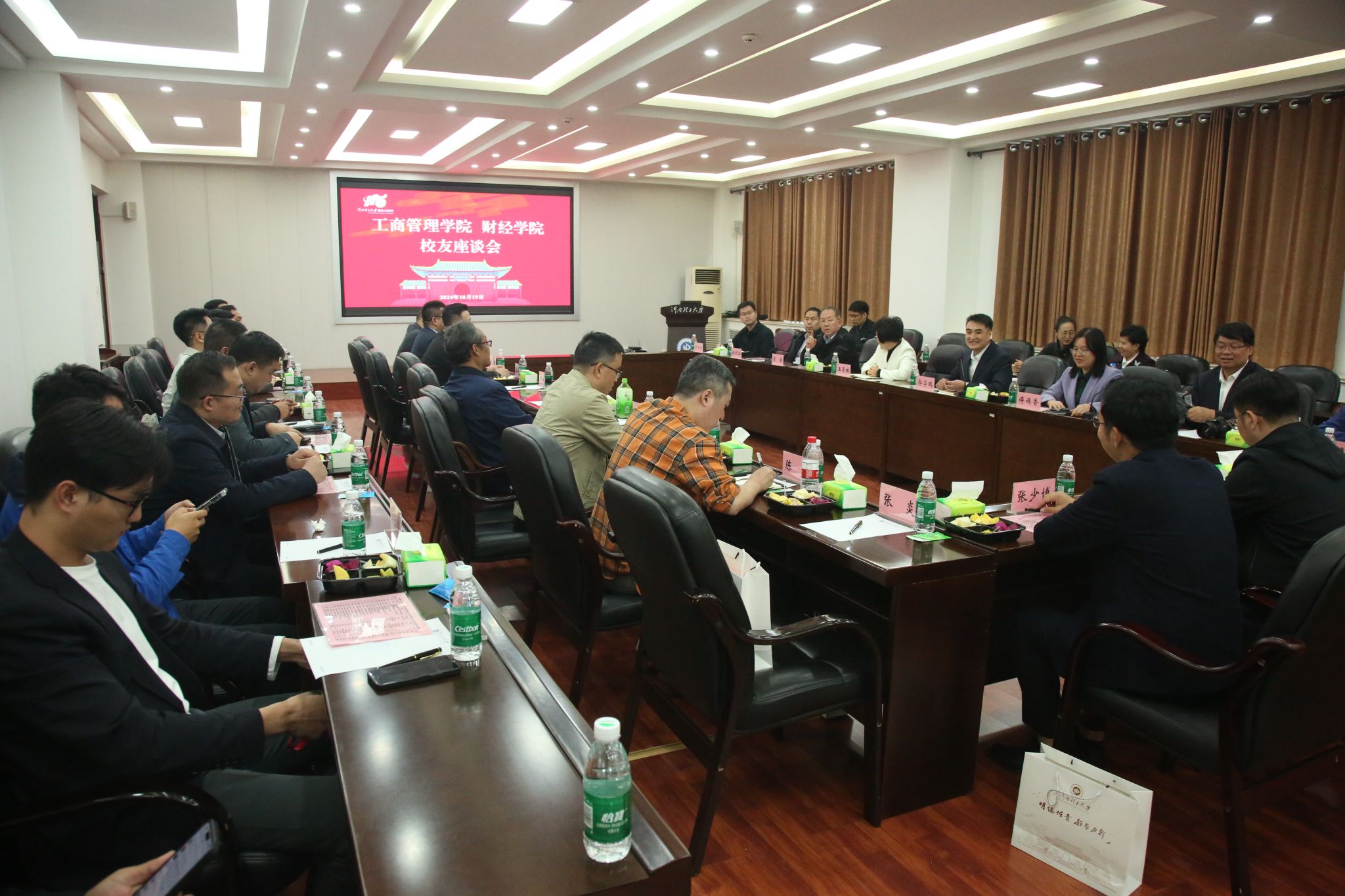 为凝聚校友力量,共话学院发展与未来,10月19日下午,工商管理学院与财经学院在经管楼1105会议室举办校友座谈会。工商管理学院和财经学院现任领导班子成员以及教师代表和优秀校友代表参加会议。会议由工商管理学院党委书记郭学鹏主持。