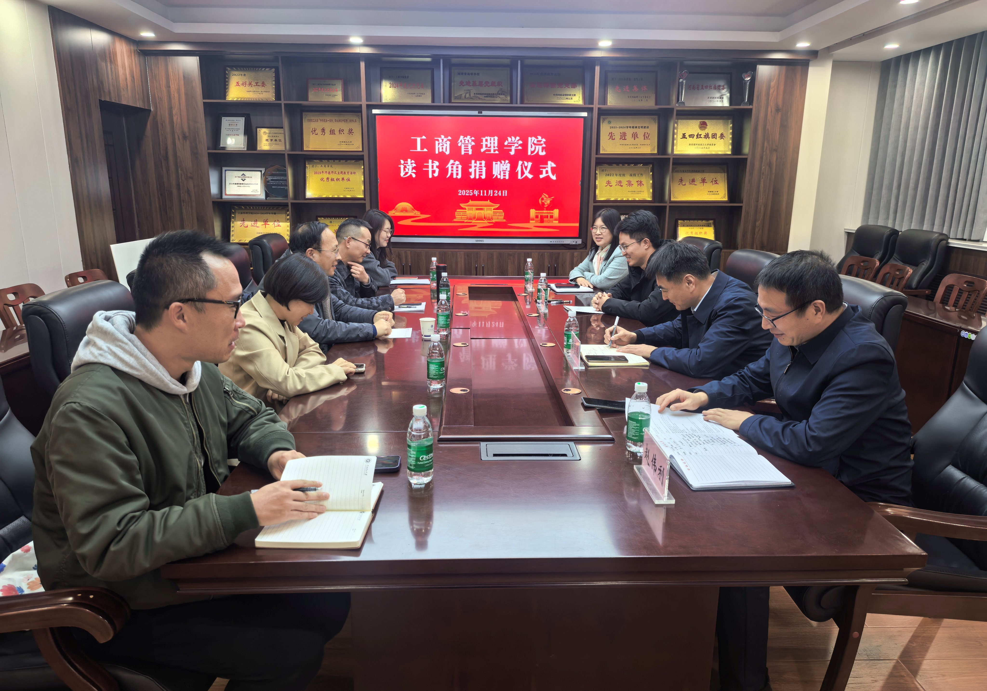 傅端香首先代表学院对校友们的慷慨捐赠表示由衷感谢,并强调校友捐赠是助力学院持续发展的珍贵财富。叶建深情回顾了在母校的求学经历,感谢母校与老师们的悉心培育,并表示将继续关注支持学院发展。与会人员就人才培养、专业建设、校企合作等方面进行深入交流。郭学鹏介绍了学院近期的建设发展情况,他指出,此次校友捐赠设立的读书角,旨在丰富学院文化设施,为师生搭建舒适的阅读交流平台,助力学院浓厚书香氛围的营造。同时,他也希望校友能常返母校,共忆青葱岁月,共话母校发展。