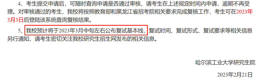 哈尔滨工业大学预计将于2023年3月中旬左右公布复试基本线,复试时间、复试形式、复试要求等相关信息另行通知,请考生密切关注学校研究生招生网发布的相关信息。