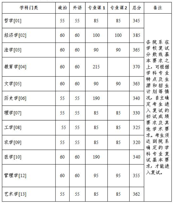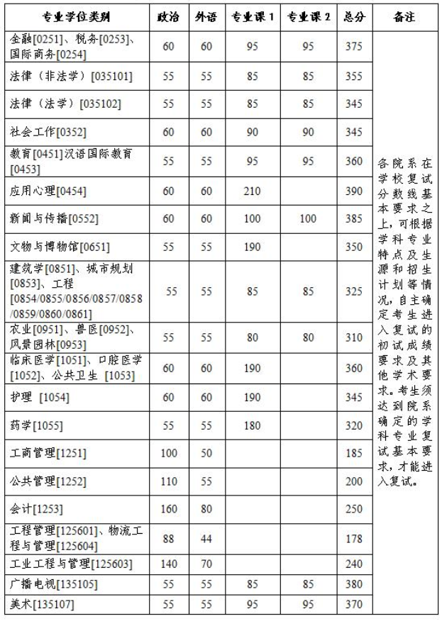 初试总分不低于300分,英语、政治单科不低于40分,业务课一、业务课二单科不低于70分。