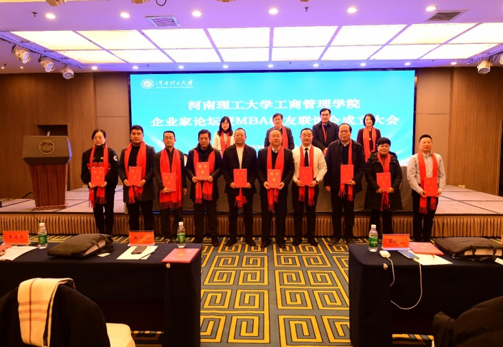 原工商管理学院院长曾旗当选为MBA校友联谊会会长,郑州莱士血液制品有限公司董事长雷文成当选为MBA校友联谊会常务副会长,商丘工学院董事会办公室主任袁桥当选为MBA校友联谊会秘书长。随后主席台上领导为当选顾问、会长、常务副会长、副会长、秘书长、副秘书长颁发了聘书。