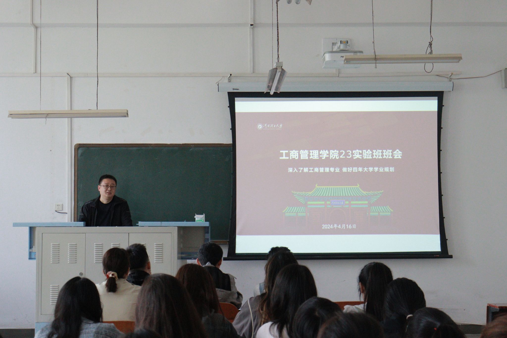 为帮助23级同学突破大学生活模糊化路线,塑造独立充实的自我,确立自身发展方向,我院于2024年4月16日在经管楼1202教室举行了“深入了解工商管理专业,做好四年大学学业规划”主题班会,我院副院长23级实验班班主任范志强、工商系系主任23级实验班副班主任李志芳、20级优秀学生代表杜磊、于温馨、索航以及23级实验班全体同学出席会议。