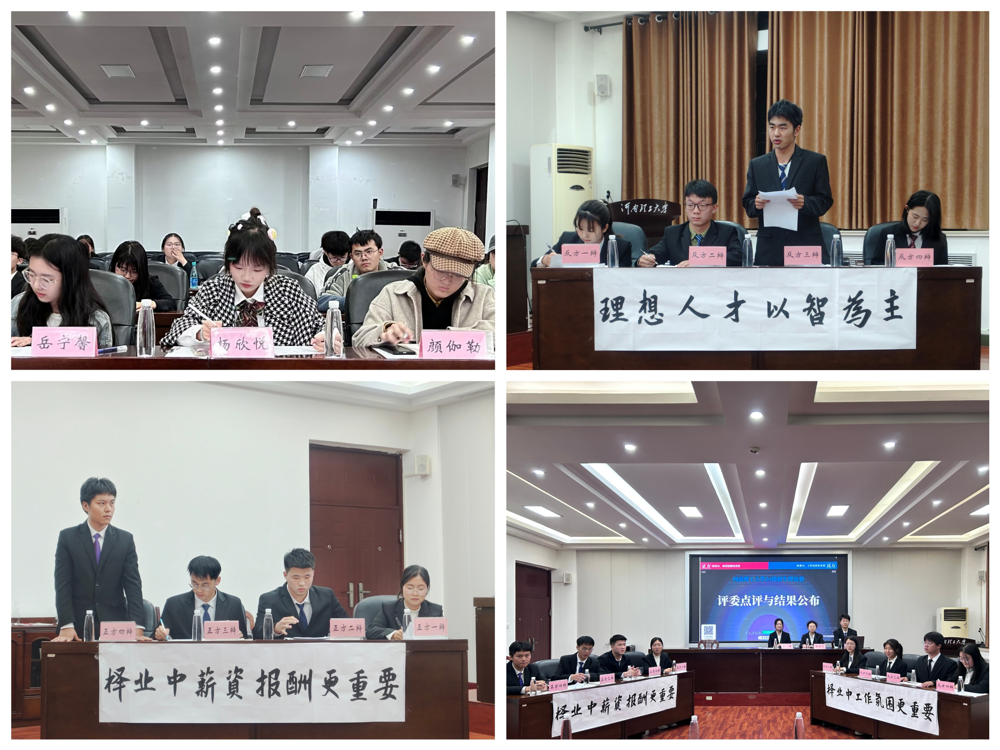 下半场比赛中,正方以“择业中薪资报酬更重要”为辩题,反方以“择业中工作氛围更重要”为辩题,双方展开激烈的对辩与竞争。辩论中,正反双方各执一词,正方提到华为以高薪吸引人才,凸显薪资报酬在择业中的关键作用;反方则以海底捞独特的工作氛围打造出优质的服务为例,阐述良好氛围对长期发展和工作积极热情的意义,选手们的精彩发言赢得评委和观众的阵阵掌声。经过评委的打分和评选,反方团队获胜,反方四辩获得本场比赛的最佳辩手。