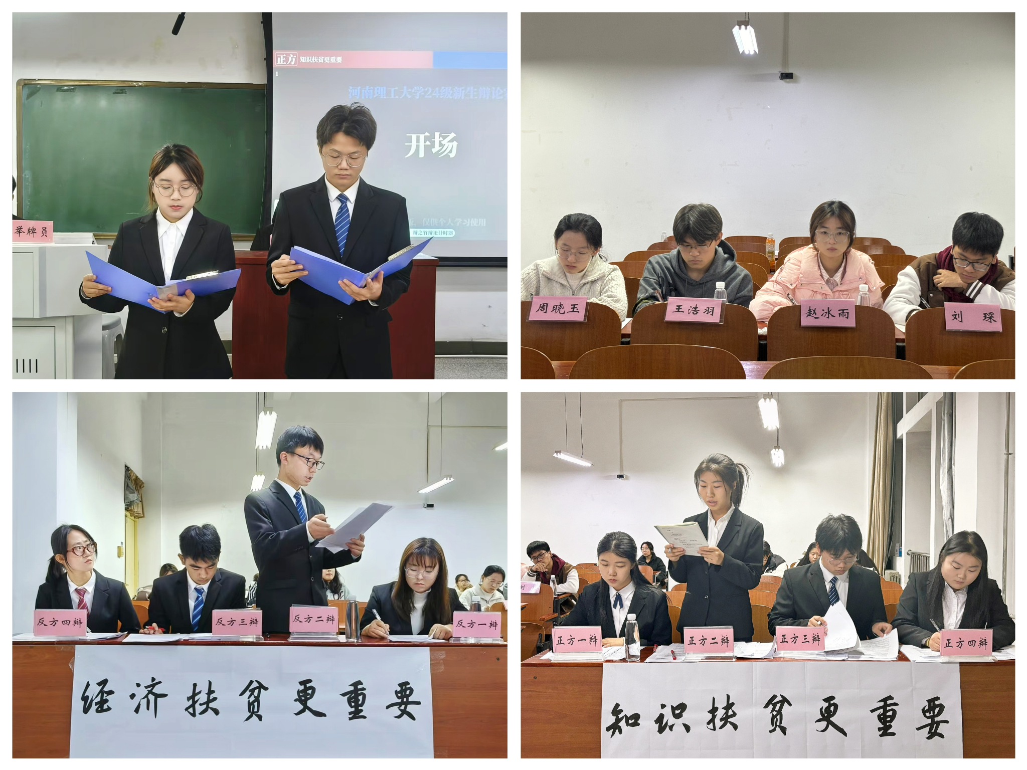 比赛伊始,主持人致开场白并宣布辩论赛正式开始。此次辩论主题为“正方知识扶贫更重要,反方经济扶贫更重要”。在正式比赛中,正反方一辩快速切入主题,清晰阐述论点。正方认为知识扶贫是破解贫困问题的根本,通过教育和知识传授,能赋予贫困人口技能与智慧,提升其自我发展能力。反方则强调经济扶贫的重要性,在很多贫困地区民众温饱未解决,急需资金完善基础设施和供应生活物资,经济扶贫能迅速改善生活状况。自由辩论环节将气氛推向高潮,辩手们思维敏捷、言辞犀利、旁征博引,从不同角度论证观点,精彩发言频出,展现出辩手对扶贫问题的深刻理解。接下来是评委点评阶段,在评委们认真聆听与公正评判后,反方凭借出色的发挥摘得桂冠,正方三辩荣获最佳辩手。最后,主持人宣布本次比赛到此结束。