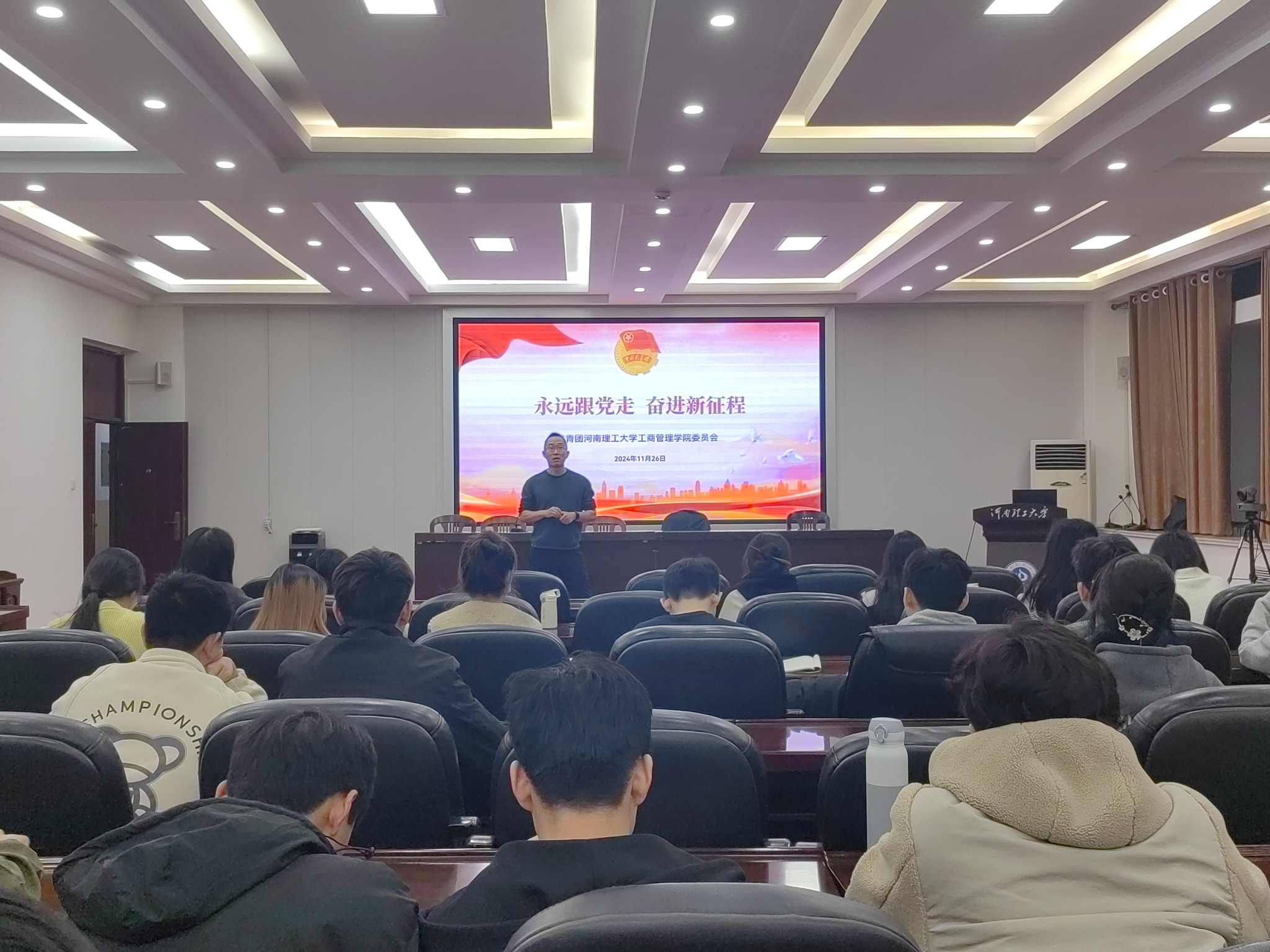 为深入学习党的二十大精神,积极投身全面建设社会主义现代化国家的伟大事业,我院于11月26日在经管楼1105室召开“永远跟党走,奋进新征程”主题团课。会议由团委书记卢宏亮主持,我院全体团员参加。