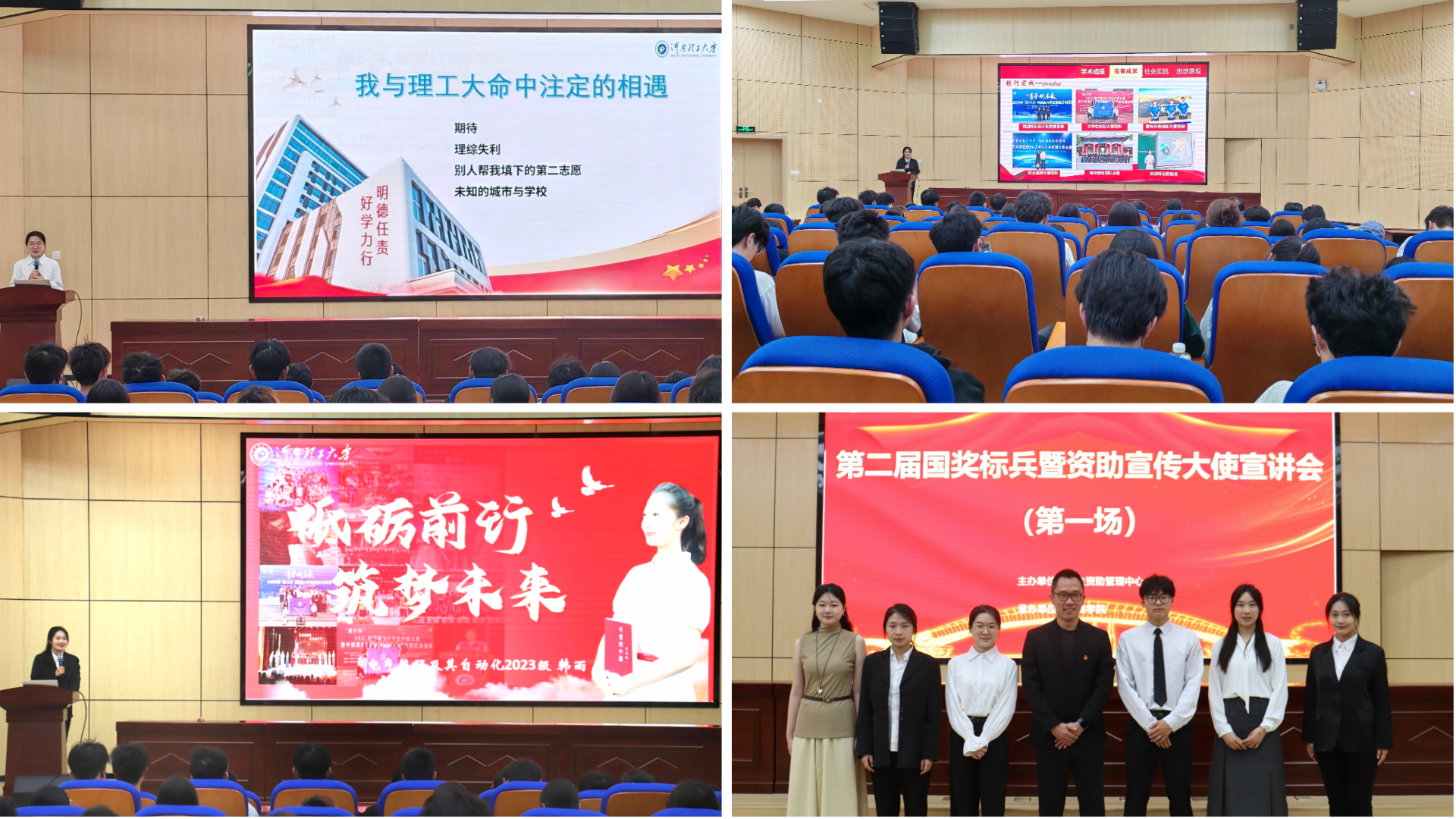 宣讲会上,我校七位国奖标兵暨学生资助宣传大使依次上台发言,他们结合自身成长历程,从学习方法创新到科研实践突破,从志愿服务经历到未来职业规划,全方位分享个人奋斗故事,展现了理工学子的卓越风采。其中,我院张耀心以“青年无惧挑战,园中春令已至”开题,强调要从自身抓起,设立短期目标,积极进取,抓住机会走出舒适圈。外国语学院孙菡围绕“语向未来,言向世界”主题,向同学们分享“在碰撞中交融,在交融中成长”的学习方法。材料科学与工程学院王博以自身为例,告诫同学们要做好计划,专注自我,不给自己设限,成就更好的自己。活动结束后,同学们反响热烈,纷纷表示将以优秀学长学姐为榜样,珍惜学习机会,专注学业精进,在奋斗中锤炼本领,在成长中勇担使命。