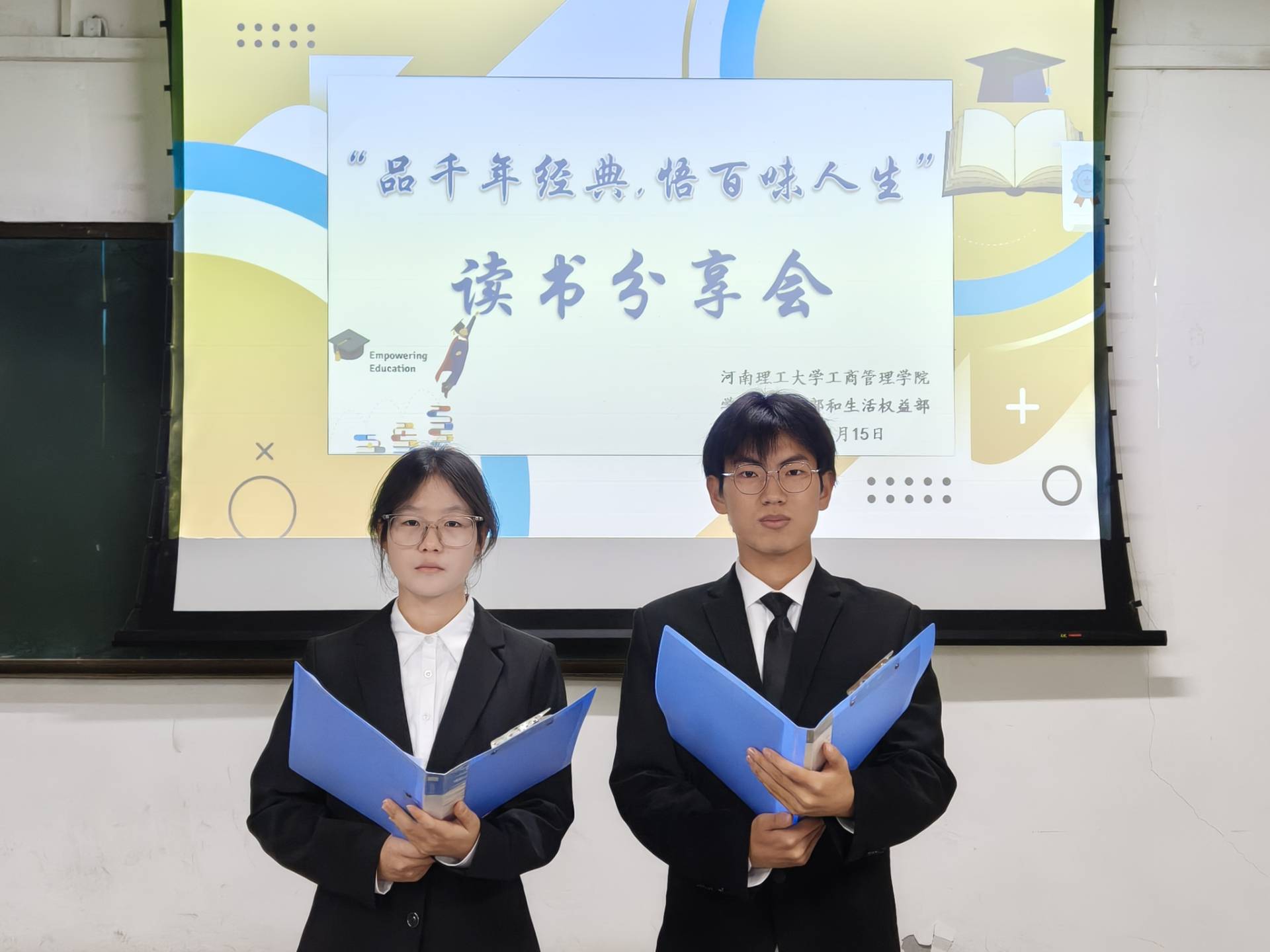 为推动同学们深化阅读体验,激励同学们在阅读中汲取成长力量,11月15日晚,工商管理学院于经管楼1103室举办了“品千年经典,悟百味人生”主题读书分享会,学生会学习部25级工作者韩颖和单乐昂担任主持人。